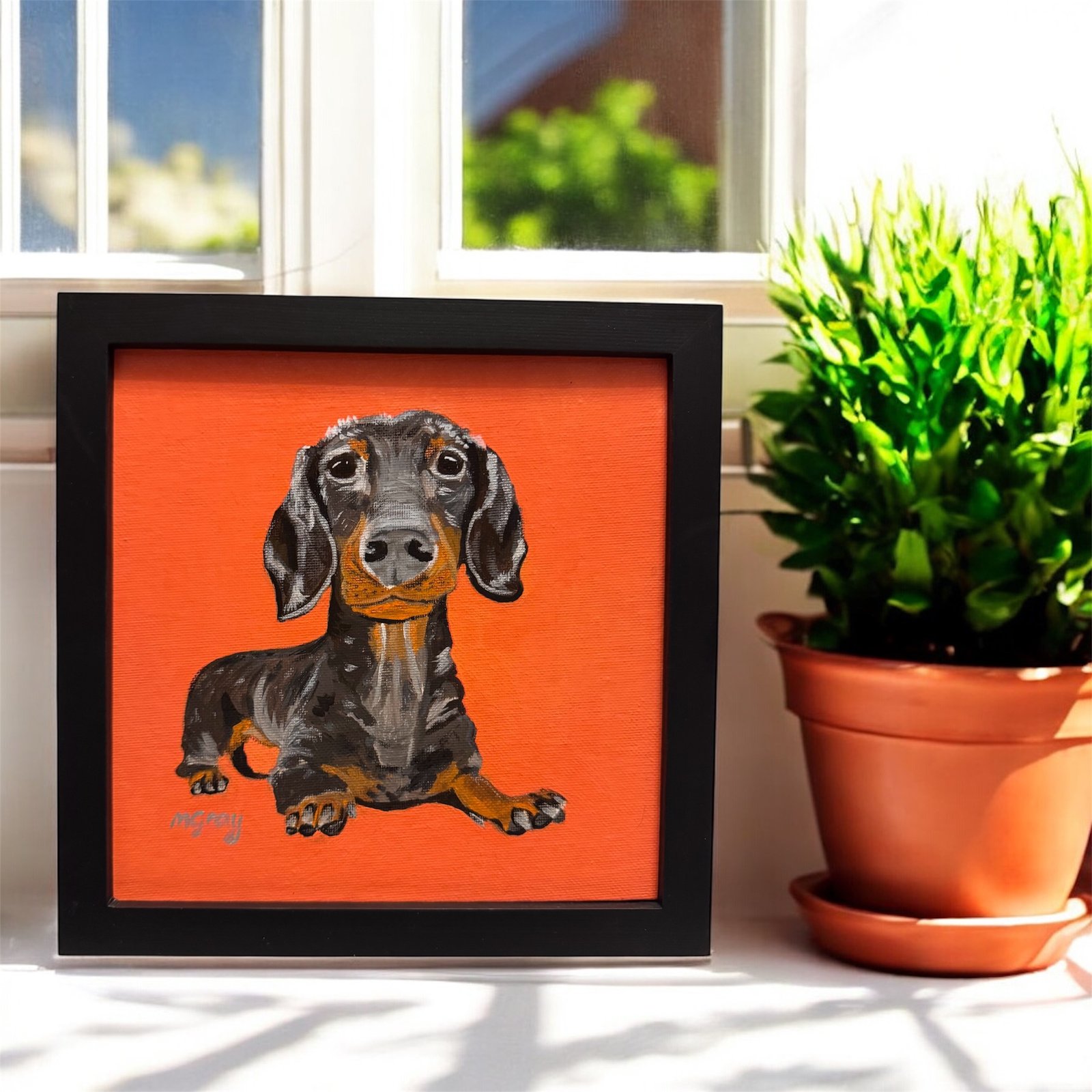 This little sausage dog knows exactly how cute it is… and isn’t afraid to use it. Painted against a bold coral background, this dachshund brings big personality in a small, long package.