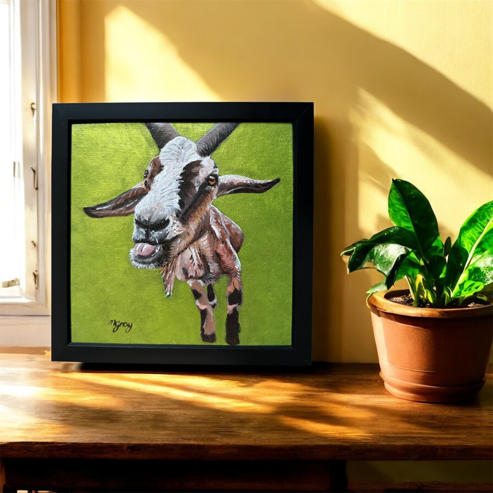 20 x 20 cm acrylic painting of a goat on a green background. Black frame included.