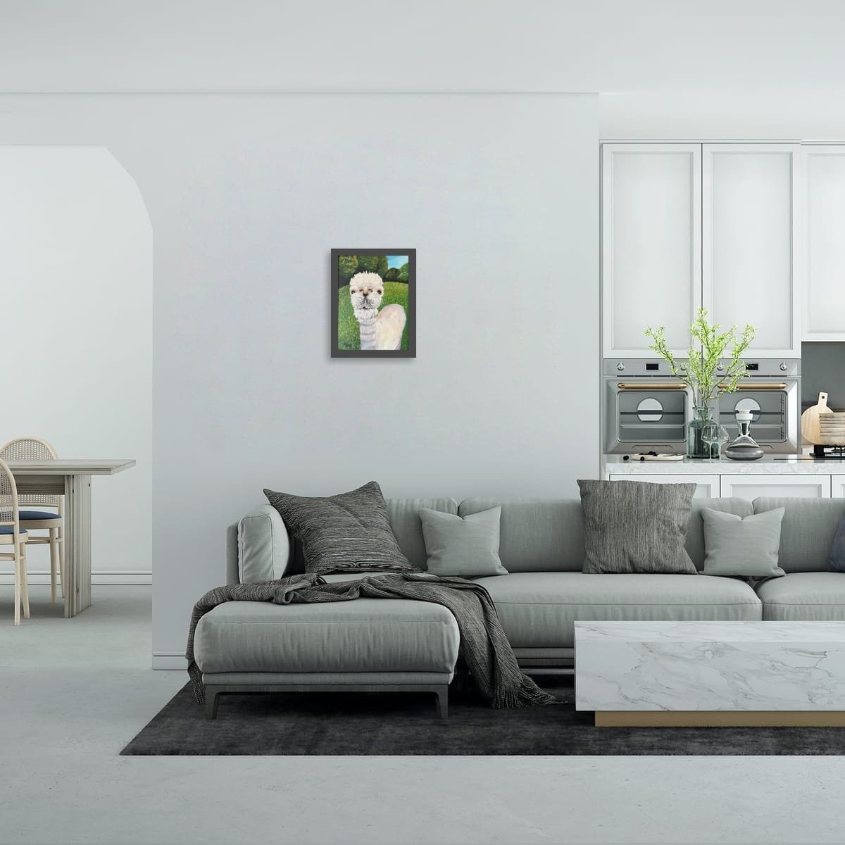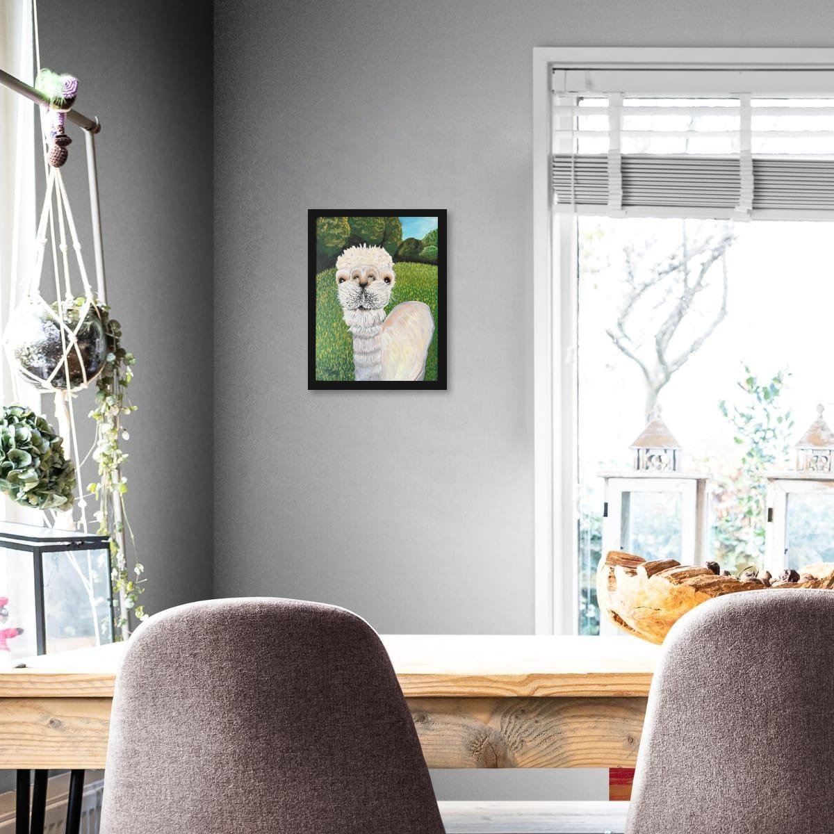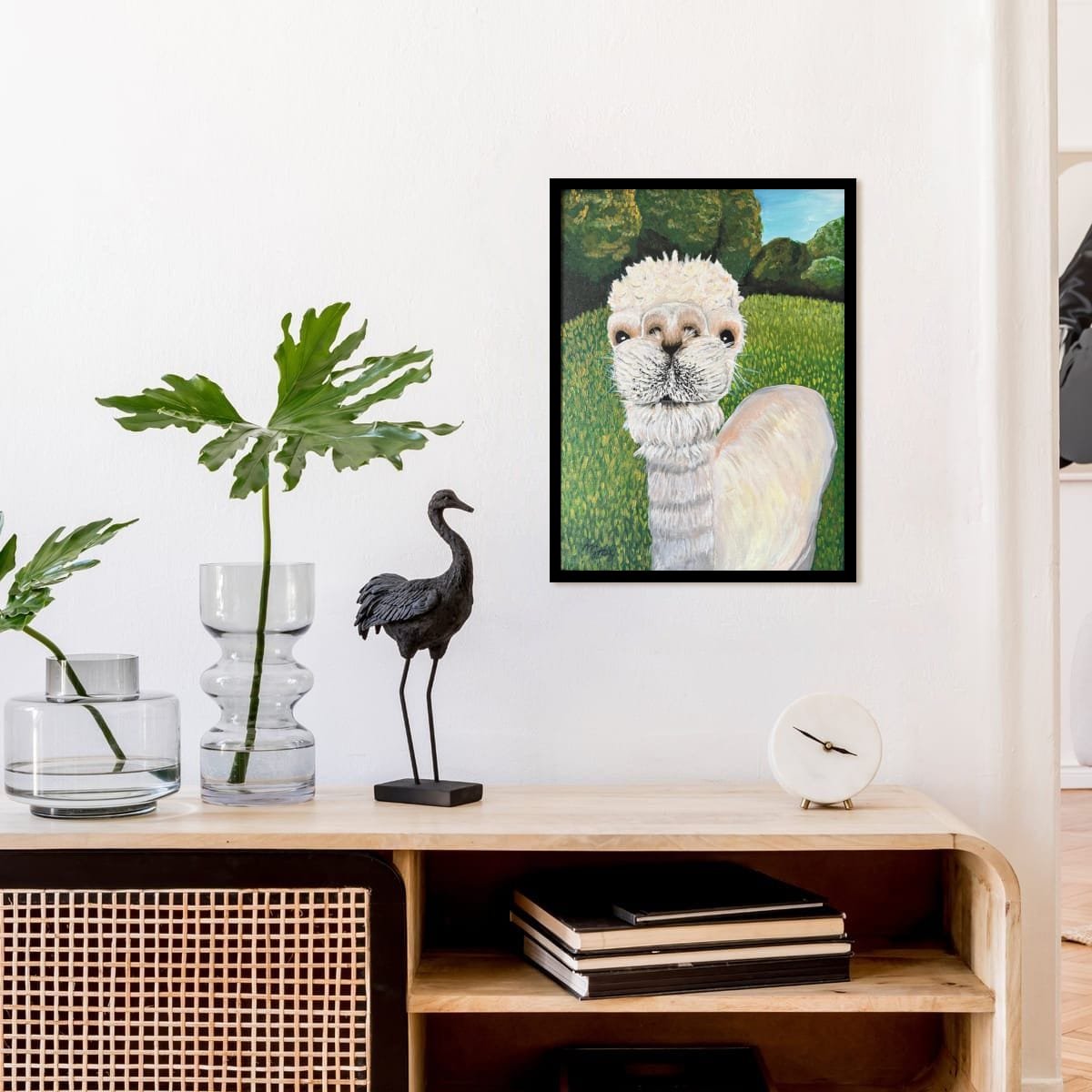 This painting is based on a photo that my bridesmaid took at my wedding. We were feeding the resident Alpacas and she took a snap of the excited and expectant face of the fella she was offering food to. His nose is high in the air as he looks up to her, hoping for something yummy to eat. He has been recently sheered so the fluffy mop on his head was to stark contrast to the close cut he had everywhere else.