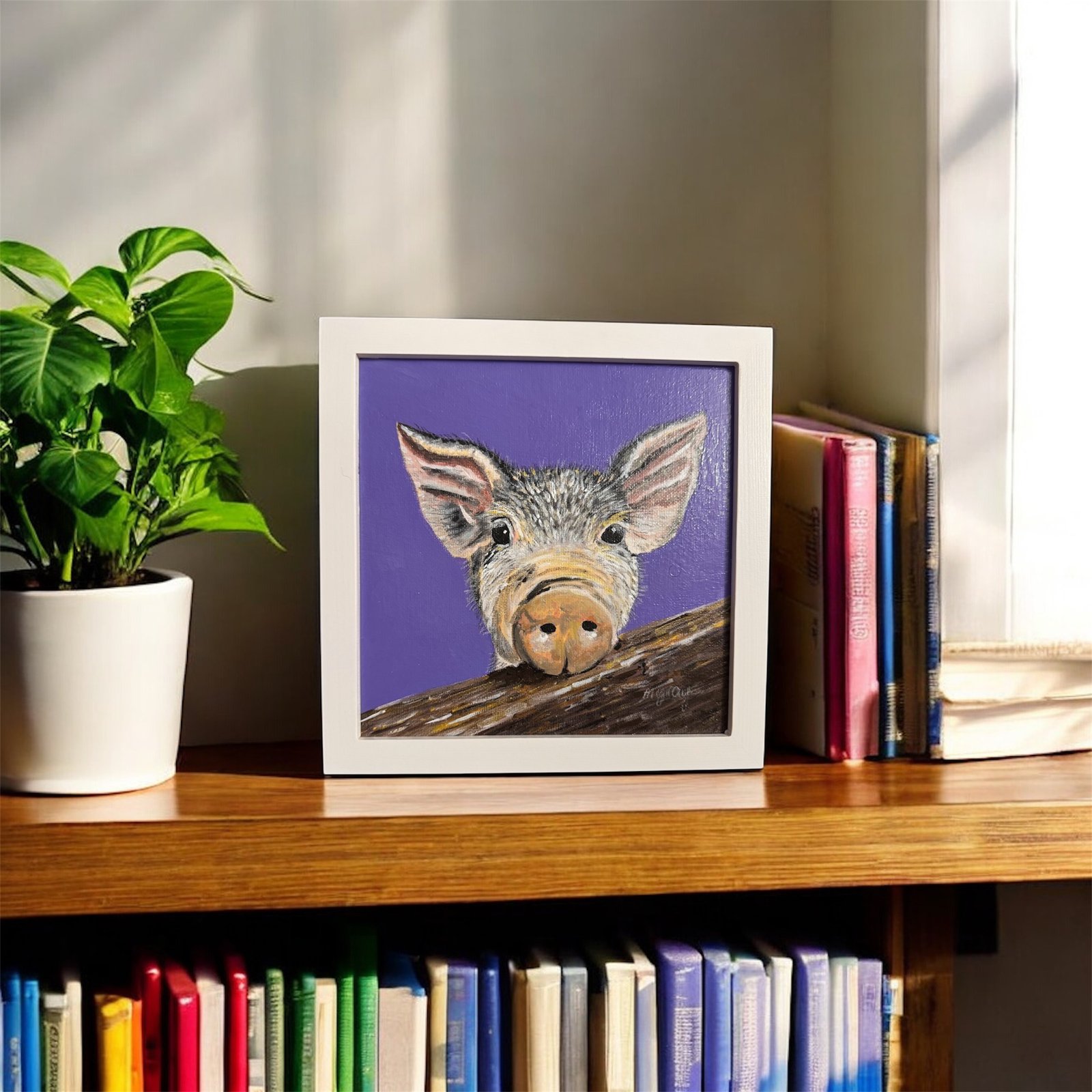 This sweet little black and white pig is just popping his head over a rustic wooden fence to say hello. With his gentle expression and curious nature, he’s full of charm and personality. Set against a soft purple background, the scene feels warm, playful, and inviting.