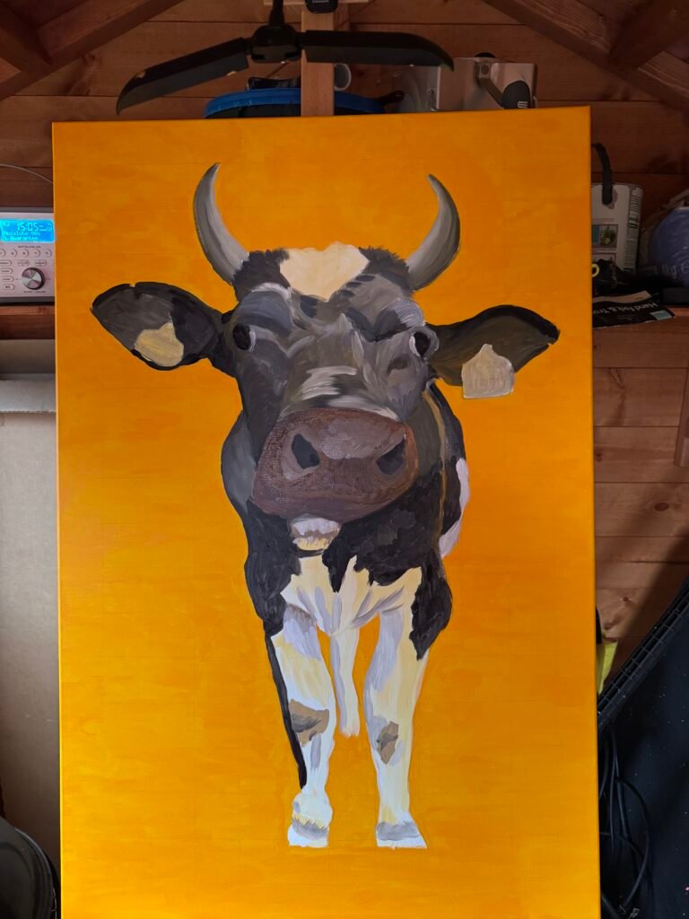 I will be painting a cow on a 90 x 60 cm stretched canvas and donating it to RABI for their charity auction to help them raise vital funds. The auction is due to take place 16th December 2025 and on this page I will be keeping you updated with my painting progress, as well as details on how you can get involved.